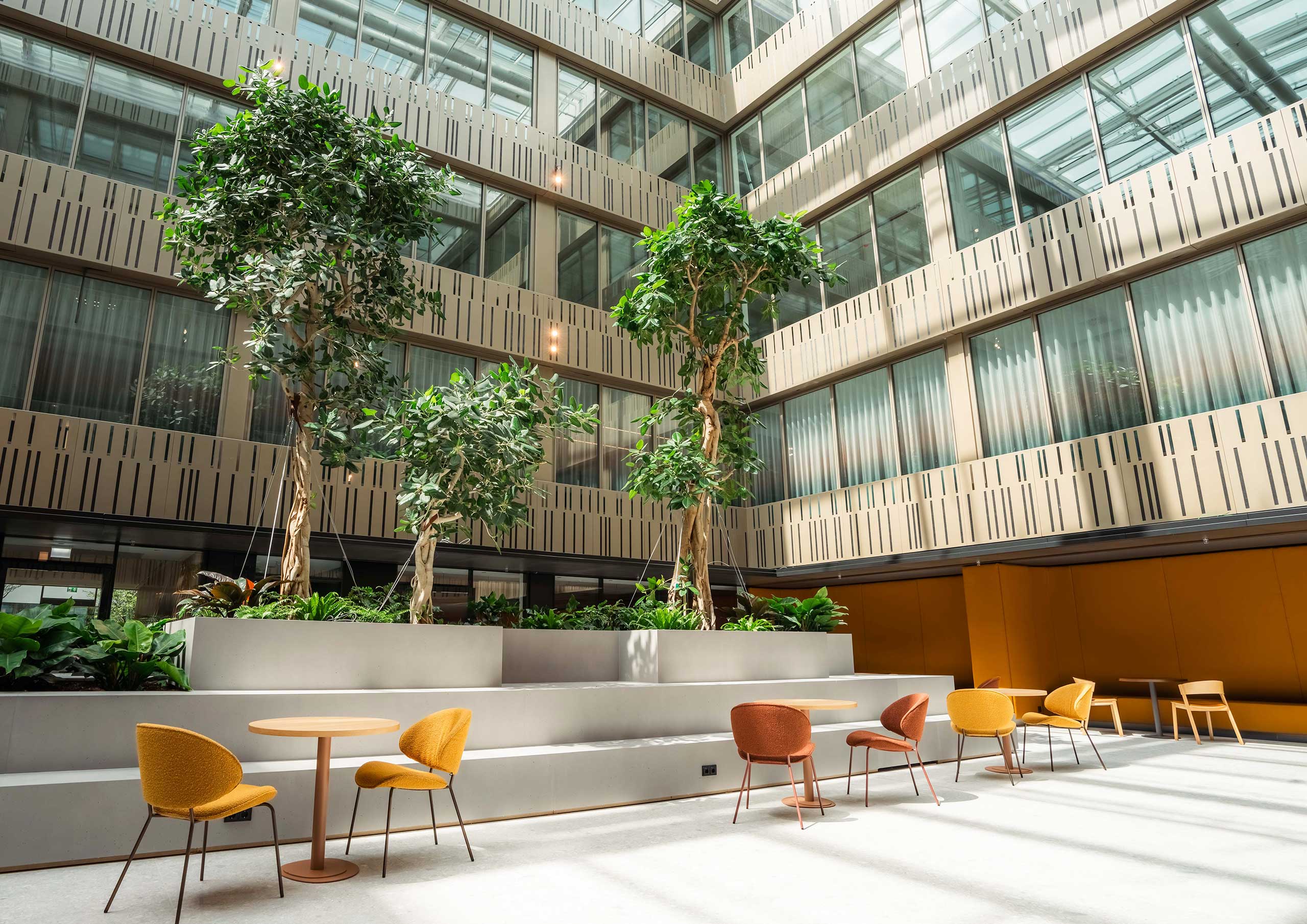 Die naturnahe Freiraumgestaltung unterstützt die geplanten LEED- und WELL-Zertifizierungen. Letztere bewertet, wie Gebäude aktiv zur Gesundheit, Zufriedenheit und Leistungsfähigkeit ihrer Nutzer beitragen – durch Licht, Luft, Wasser, Materialien und Naturverbindung. Die eingesetzten hellen Oberflächenbeläge sorgen dafür, dass maximal 20 Prozent der Sonnenstrahlung reflektiert werden – eines der Kriterien für die angestrebte LEED-Zertifizierung.